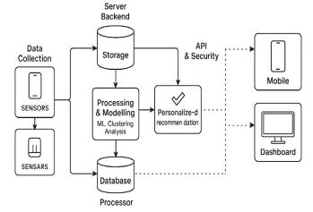 As shown in Figure 4, data are first collected by the mobile application, then transmitted to the backend server for storage. The data are subsequently processed through modules for clustering and classification. Finally, a recommendation engine generates personalized feedback delivered to the end user via the mobile interface or dashboard.