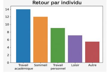 Personalized feedback provided to users is based on a multidimensional analysis of collected data, combining statistical methods such as clustering and principal component analysis with supervised predictive models. Feedback includes diagnostics on task fragmentation, imbalances between activity domains, and well-being indicators such as sleep quality. Based on this, STUR offers concrete, tailored recommendations aimed at fostering better structuring of academic work periods to reduce cognitive dispersion, encouraging regular sleep and recovery routines, integrating active breaks through sports or social interactions to enhance stress resilience, optimizing digital tool usage to improve focus, and adjusting paid workloads in line with individual capacities and goals.