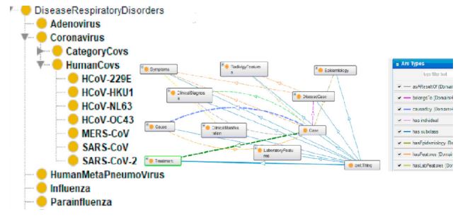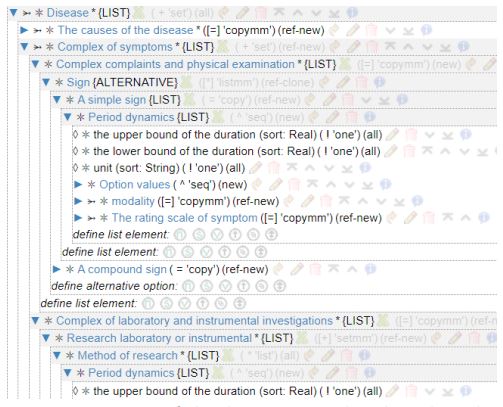 b) Terminology used. The semantics of ontology terms (disease, symptom complex, a necessary condition for the disease, periods of disease development, and many others) are understandable to doctors of all profiles, moreover, their description structure also provides assistance to doctors in the formation of knowledge. The use of a single terminological base when describing knowledge about a disease provides both a single interpretation of all terms used and their reuse.