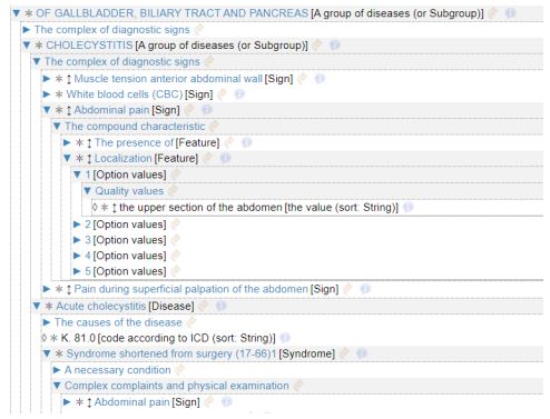 On the basis of the described ontology, using the “Base of Medical Terminology and Observations”, knowledge bases of diseases and syndromes from various nosological groups for decision support systems in medicine were formed. They are combined into a common information resource “Knowledge base on diagnostics of diseases and syndromes”, which is located on the IACPaaS platform [Грибова, 2017]. The grouping of diseases corresponds to the structure of the ICD-10. The knowledge base includes a description of diseases from such sections as: “Diseases of the circulatory system”, “Diseases of the digestive system”, “Diseases of the genitourinary system”, “Infectious and parasitic diseases”, etc. The groups of diseases unite conceptually related diseases. For example, the group of diseases “Diseases of the digestive system” consists of groups of diseases - “Diseases of the esophagus”, “Diseases of the stomach and duodenum”, “Diseases of the intestine”, “Diseases of the liver”, “Diseases of the gallbladder, biliary tract”, etc. Each group diseases groups diseases with a common set of diagnostic signs, which includes signs characteristic of this group. So for the group of diseases “Diseases of the digestive system” in the complex of diagnostic signs includes one symptom “Pain in the abdomen”. For the group “Diseases of the gallbladder and biliary tract”, the diagnostic complex includes 5 signs: “Abdominal pain”, “Nausea”, “Itching”, “Increased body temperature”, “Tension of the muscles of the anterior abdominal wall.” For the group of diseases “Cholecystitis”, more than 20 signs are already diagnostic: all the same signs plus “Flatulence”, “Vomiting”, “Belching”, “Nausea”, “Bitterness in the mouth”, “Leukocytes”, “ESR”, “Thickness gallbladder wall for ultrasound “, etc. A fragment of the information resource “Knowledge Base on Diagnosis of Diseases” is shown in Figure 5.