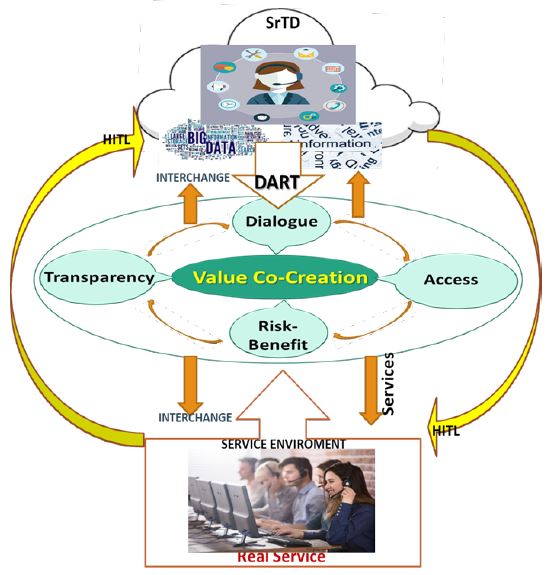Our novel conceptualization of SrDT for smart services is depicted in Figure 2. As illustrated, it combines the commonly used and empirically validated five-dimensional DT model (5D-DT) [3,24,49], advanced logic of value as articulated by the SD-logic and its DART (Dialogue, Access, Risk-benefit, Transparency) model [50], and by human input support (HITL) [42]. The proposed framework captures the integration of heterogeneous analytical models and evolving data related to the entire service life cycle.