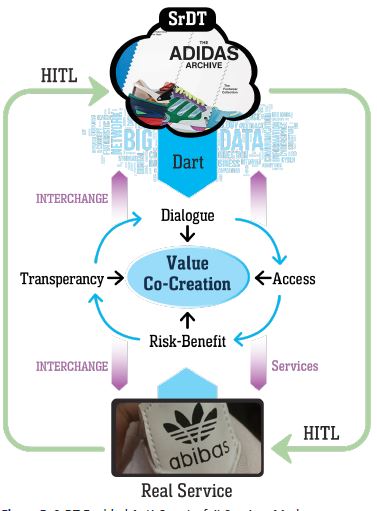 The distinct contributions of the SrDT paradigm to services concern the seamless synchronization with several pioneering technologies such as the IoT, AI, big data, streaming data analytics, software-defined cloud/fog environments, blockchain, etc. In essence, SrDTs provide the foundation for creating realistic and interactive metaverse experiences. In this conceptual article, we have proposed SrDT as a data fusion technology that is capable of aggregating and integrating heterogeneous data and models and establishing value co-creation, thus enhancing CX. SrDT can serve as a platform in which a combination of different embedded technologies, tailored for a specific service, is used to collect, process, and integrate data and design models, thus providing bi-directional data linkage between the real and digital world. This combination of strategic solutions promises to create, in our view, a truly complete picture of the monitored service, in contrast to common standalone solutions. Indeed, the SrDT, as a virtual mirror, enables an understanding of a smart service as more than the sum of its digital representations. The integration of a consumer-centric element into SrDT means that the impact of even small changes in consumer be havior and data can be assessed much sooner and without the need for survey research. SrDT allows service design scenarios to be thoroughly tested to predict their performance. Thus, we conceptualize SrDT as an integrated and synchronized framework that facilitates the aggregation, description, prediction, prescription, and visualization of one or more characteristics of a service or class of services within a real service environment like anti-counterfeiting. Consumer confidence, business credibility, and economic development are all negatively impacted by the prevalence of counterfeit assets in circulation. The potential role of SrDT technology in finding a solution to this issue has been explored in the article. SrDT represents a cutting-edge solution that mitigates counterfeit risks as it can accurately emulate hardware, software, and firmware. By collecting and providing data, it allows real-time monitoring, integration, analysis, and emulation. The proposed H5D-SrDT/DART framework as a systematic expression of the components, behaviors, and rules of conceptual SrDT for services has valuable theoretical and practical implications while suggesting several avenues for future research.