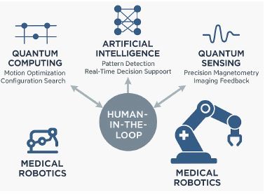 Such hybrid methods may eventually be applied to surgical robot subsystems (e.g., locked-arm motion around anatomy or instrument path optimization) where latency and accuracy are paramount. They show how QC need not appear as a blanket control system but rather as a kernel accelerator tucked inside traditional robotic structures. Perception, sensor fusion, and image-based guidance is a second promising area. Although quantum algorithms for real-time live imaging are in their initial stages of development, quantum-enhanced sensing—notably Nitrogen-Vacancy (NV) diamond magnetometry and quantum photonics—has already been pushed to sub-millimetric accuracy in the measurement of magnetic-field and thermal distributions [3]. Such technologies may eventually complement robotic navigation or neurostimulation guidance.