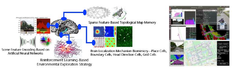 The core issue is to address the problem of autonomous exploration and environmental recognition by unmanned systems, and achieving self-location/navigation under conditions where prior geographic information is missing and satellite navigation is unavailable. The technical Advantages include: A navigation system that does not require precise geometric calculations; Simulating animal navigation behaviors and integrating biological positioning with artificial neural network technologies to construct a navigation system; Robust to environmental changes; Online learning and mapping in unfamiliar environments.