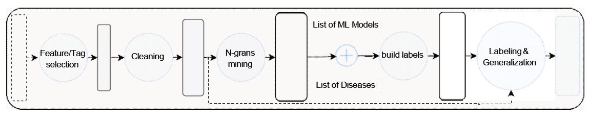 The process began with selecting key tags like “abstract,” “publication date”, and “PMID” from the PubMed text. After refining the data, we applied n-grams mining. The results of this mining process were then combined with two lists of known diseases and ML models. As a result of this merger, a collection of names and labels was developed, which was then used to annotate the abstracts. To improve label uniqueness and analytical generalization after annotation, we used a duplication elimination. Refer to (Figure 3) for visualization, with detailed explanations in the following steps.
