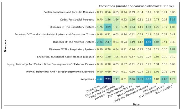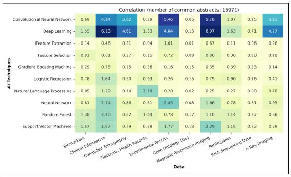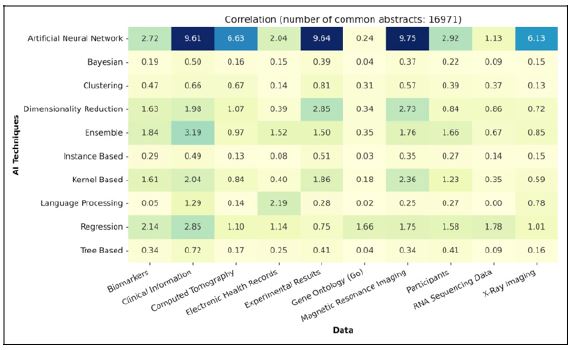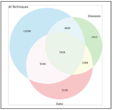 In the pursuit of investigating the correlations between top AI techniques, diseases, and data in healthcare research, we selected abstracts that encompassed both relevant items. For instance, in analyzing the correlation between AI techniques and diseases, we specifically chose abstracts containing labels for both AI techniques and diseases. The rationale behind this selection was to place significant emphasis on elucidating the intricate interplay and relationships between these key categories.
