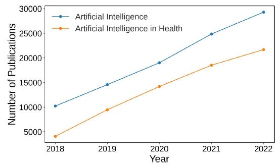 As it is shown in (Figure 5), starting from 2018 to 2022, the number of AI publications contributed to healthcare are relatively high. The number of health-related machine learning papers has exhibited a remarkable year-on-year increase, show casing the rapidly evolving interest and advancements in this interdisciplinary field.