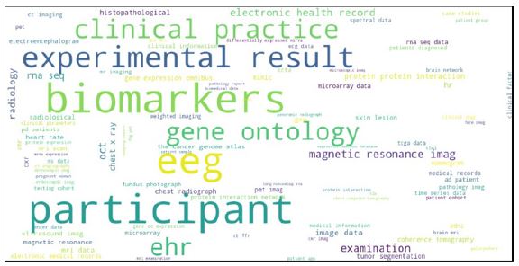 The data wordcloud, (Figure 8), illustrates the most data that have been instrumental in training and validating AI and ML techniques in healthcare. Identifying terms as datasets solely based on their use in abstracts is challenging. However, we’ve made an effort to compile terms that, according to our internet search results, could potentially qualify as data. The difficulty arises from the complexity and diverse nature of datasets and databases mentioned in the abstracts. For example, some databases are so general that are capable of storing a wide array of data types, which adds another layer of difficulty to our task of selecting and categorizing terms based solely on abstracts. As depicted in the wordcloud [8], terms such as biomarkers, experimental results, or data generated by some participants are among top used data. However, the more technical data such as Electroencephalogram (EEG), Electronic Health Records (EHR), Computed tomography, Magnetic Resonance Imaging (MRI), clinical data, and Genomics data occupy prominent positions, emphasizing their critical role in shaping the performance and accuracy of ML models in medical applications.
