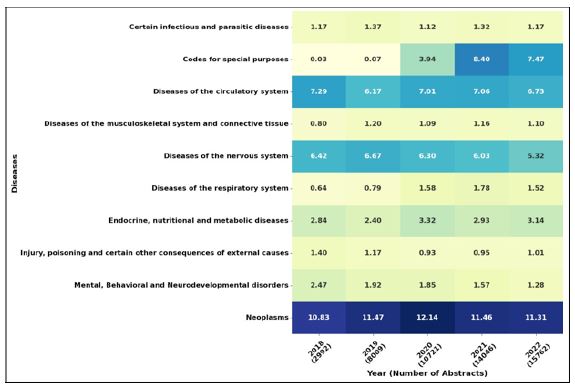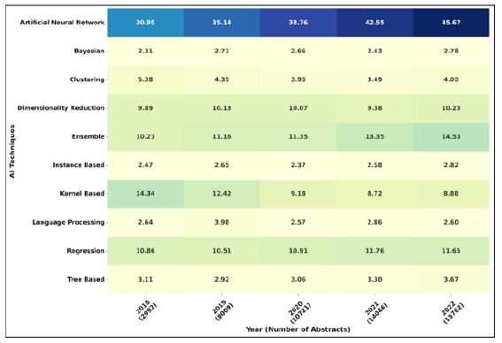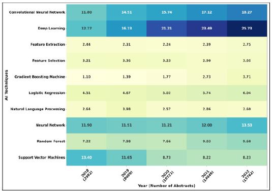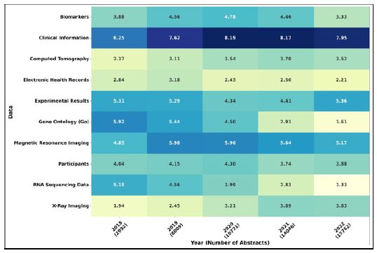 Temporal analysis with 2D tables and heatmaps: We dive deeper into our investigation by analyzing the distribution of abstracts across different years. Utilizing 2D tables and heatmaps, we visualize the percentage of abstracts focusing on various AI techniques, diseases, and data types for each year. This enables us to identify potential shifts in trends over time.