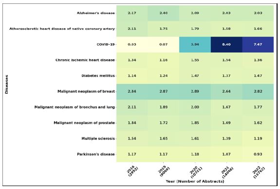 Considering the first category, as depicted in (Figure 11), the prominence of Covid-19 in healthcare research from 2020 to 2022 is unsurprising, considering the global impact of the pandemic during this period. Interestingly, Malignant Neoplasm and Heart Disease also garnered significant attention, representing the second-tier focus among the top diseases. Furthermore, the attention distribution of other diseases remained relatively consistent throughout 2018-2022, following a same distribution pattern.