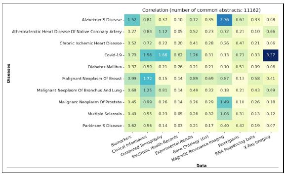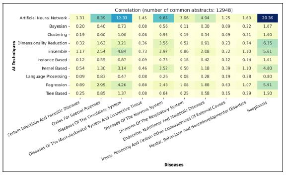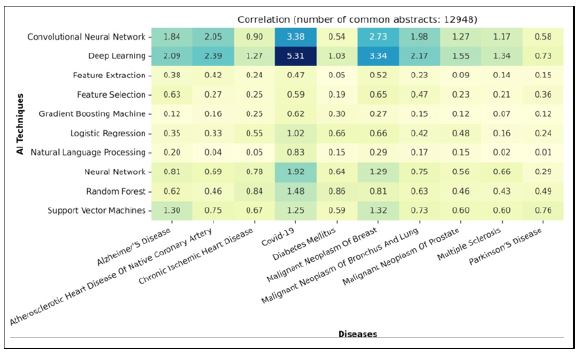 Significantly, Covid-19 exhibits a strong correlation with Deep Learning, Convolutional Neural Networks (CNNs), and to a lesser extent, Neural Networks, underscoring their collaborative impact. Furthermore, the correlation of Covid-19 with other AI techniques remains notably high, surpassing other diseases except for Malignant Neoplasm of Breast and Alzheimer’s Disease. Its association with various AI techniques underscores the thorough exploration of approaches for this unique phenomenon.
