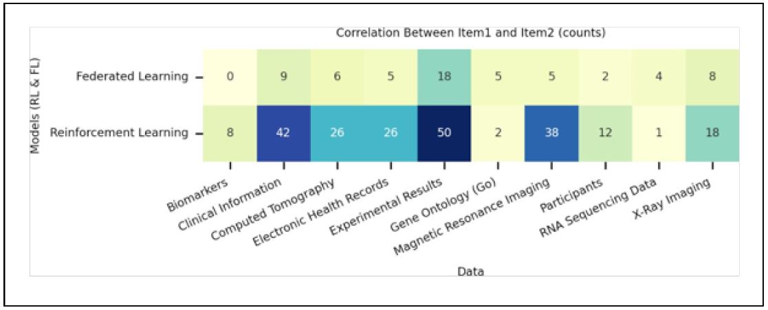 This section delves into an analysis of the trend data from 2018 to 2022, showcasing the remarkable growth of Federated Learning (FL) and Reinforcement Learning (RL) in healthcare applications. (Figure 20) depicts a line graph demonstrating the year- by-year increase in using FL and RL in the healthcare field. The trend data from 2018 to 2022 shows that FL and RL have grown in popularity in healthcare. RL grew significantly, from 50 in 2018 to 212 in 2022 (a more than 4-fold rise), whereas FL grew more rapidly, from 7 in 2018 to 89 in 2022 (a 12-fold increase). Given the yearly growth patterns, FL is clearly on course to overtake RL in popularity, perhaps becoming one of the top models used in healthcare. Both models are on an upward trend, with each year witnessing a significant increase in popularity rates. Additionally, (Figure 20) illustrates that RL’s popularity has grown considerably more rapidly than FL. An essential point to note is that FL is still in its early stages of usage, which may account for its slower growth rate.