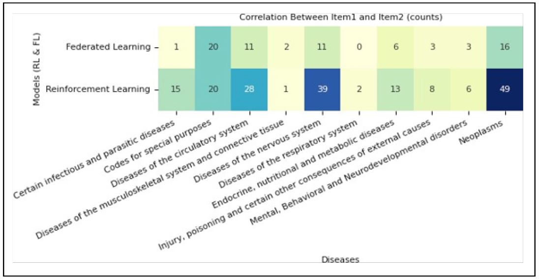 Regarding the relationship between FL and RL with top diseases, as depicted in (Figure 22), the top diseases addressed by reinforcement learning are Neoplasms, Diseases of the Nervous System, and Diseases of the Circularity System, which shows similar preference as other top models depicted in (Figure 15). However, for federated learning, the top addressed disease is Covid-19 (i.e., in the level 2 categorization specified as Codes For Special Purposes), which shows the researchers’ try to explore all.