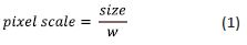 To calculate the scale of the pixels in an image given the distance of the foreground in the scene (Depth), information about the camera specifications, such as the camera’s Field of View (FOV) and the pixel dimensions of the sensor (W) is used. The formula for calculating the pixel scale is as follows: