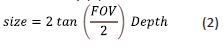 where Size corresponds to the actual length that an object at distance Depth from the camera should have in order to exactly fit withing the width of the image sensor. In that case, Size can be calculated by (2)