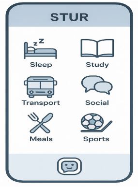 STUR supports comprehensive logging of diverse task categories—sleep, academic work, sport, employment, social activities, internet use, and declarative academic outcomes—with explicit capture of parallel tasks. Feedback is personalized based on behavioral clusters and individual profiles.