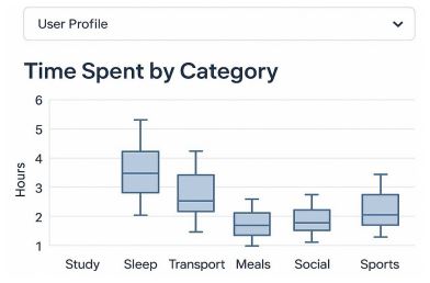 Multimodal data acquisition integrates smartphone sensor inputs (e.g., accelerometer, GPS), application usage logs, and self-report surveys. Importantly, data entry is facilitated through both manual inputs and an AI-powered conversational chatbot, enabling intuitive and flexible task logging. The application tracks a rich taxonomy of activities including sleep, academic work, sport, paid employment, social life, internet use, and declarative academic results (e.g., self-reported grades). It explicitly accounts for parallel or overlapping tasks to capture multitasking phenomena, reflecting the complexity of realworld student time use.