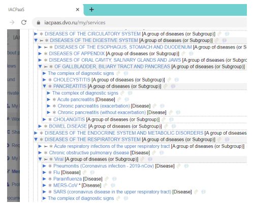 On the basis of the described ontology, using the “Base of Medical Terminology and Observations”, knowledge bases of diseases and syndromes from various nosological groups for decision support systems in medicine were formed. They are combined into a common information resource “Knowledge base on diagnostics of diseases and syndromes”, which is located on the IACPaaS platform [Грибова, 2017]. The grouping of diseases corresponds to the structure of the ICD-10. The knowledge base includes a description of diseases from such sections as: “Diseases of the circulatory system”, “Diseases of the digestive system”, “Diseases of the genitourinary system”, “Infectious and parasitic diseases”, etc. The groups of diseases unite conceptually related diseases. For example, the group of diseases “Diseases of the digestive system” consists of groups of diseases - “Diseases of the esophagus”, “Diseases of the stomach and duodenum”, “Diseases of the intestine”, “Diseases of the liver”, “Diseases of the gallbladder, biliary tract”, etc. Each group diseases groups diseases with a common set of diagnostic signs, which includes signs characteristic of this group. So for the group of diseases “Diseases of the digestive system” in the complex of diagnostic signs includes one symptom “Pain in the abdomen”. For the group “Diseases of the gallbladder and biliary tract”, the diagnostic complex includes 5 signs: “Abdominal pain”, “Nausea”, “Itching”, “Increased body temperature”, “Tension of the muscles of the anterior abdominal wall.” For the group of diseases “Cholecystitis”, more than 20 signs are already diagnostic: all the same signs plus “Flatulence”, “Vomiting”, “Belching”, “Nausea”, “Bitterness in the mouth”, “Leukocytes”, “ESR”, “Thickness gallbladder wall for ultrasound “, etc. A fragment of the information resource “Knowledge Base on Diagnosis of Diseases” is shown in Figure 5.