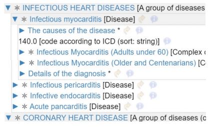 b) Terminology used. The semantics of ontology terms (disease, symptom complex, a necessary condition for the disease, periods of disease development, and many others) are understandable to doctors of all profiles, moreover, their description structure also provides assistance to doctors in the formation of knowledge. The use of a single terminological base when describing knowledge about a disease provides both a single interpretation of all terms used and their reuse.