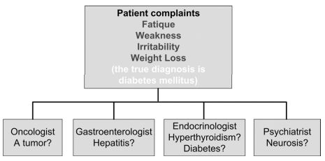 Most ontologies are highly specialized, so the implementation of diagnostic systems is carried out for a single, or at best for a small group of diseases. However, the main problems of initial diagnosis are associated with the search for possible hypotheses among a wide range of diseases with similar symptoms (that are often belong even to different branches of medicine), or with the search for comorbidity (several diseases in patients), or with the identification of acute diseases occurring against the background of chronic, sometimes absent in the anamnesis.
